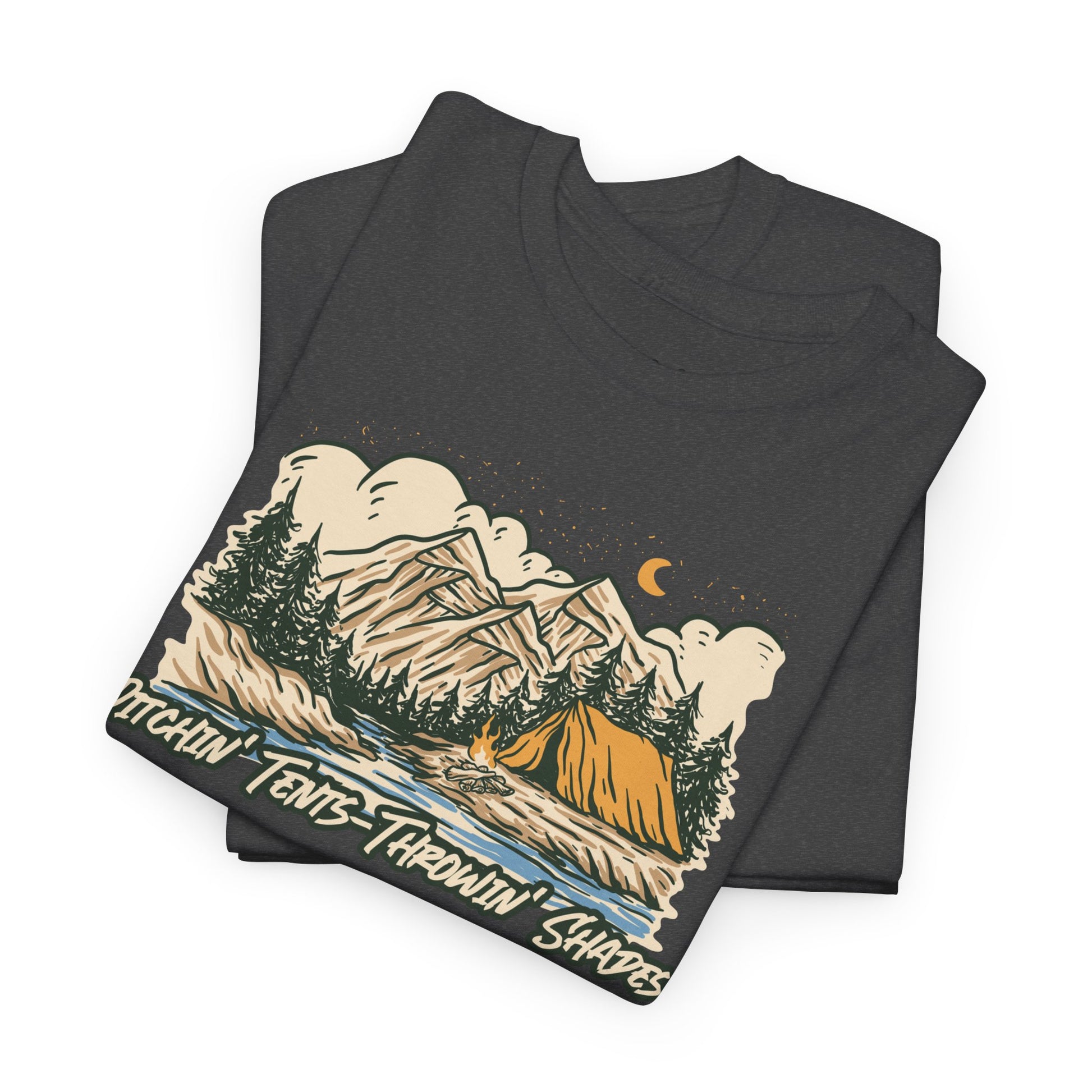 Pitchin Tents Throwin Shades – Funny Camping T-Shirt for Hikers & Outdoor Enthusiasts | Unisex Heavy Cotton Tee, Nature Lover Gift, Adventure Apparel
