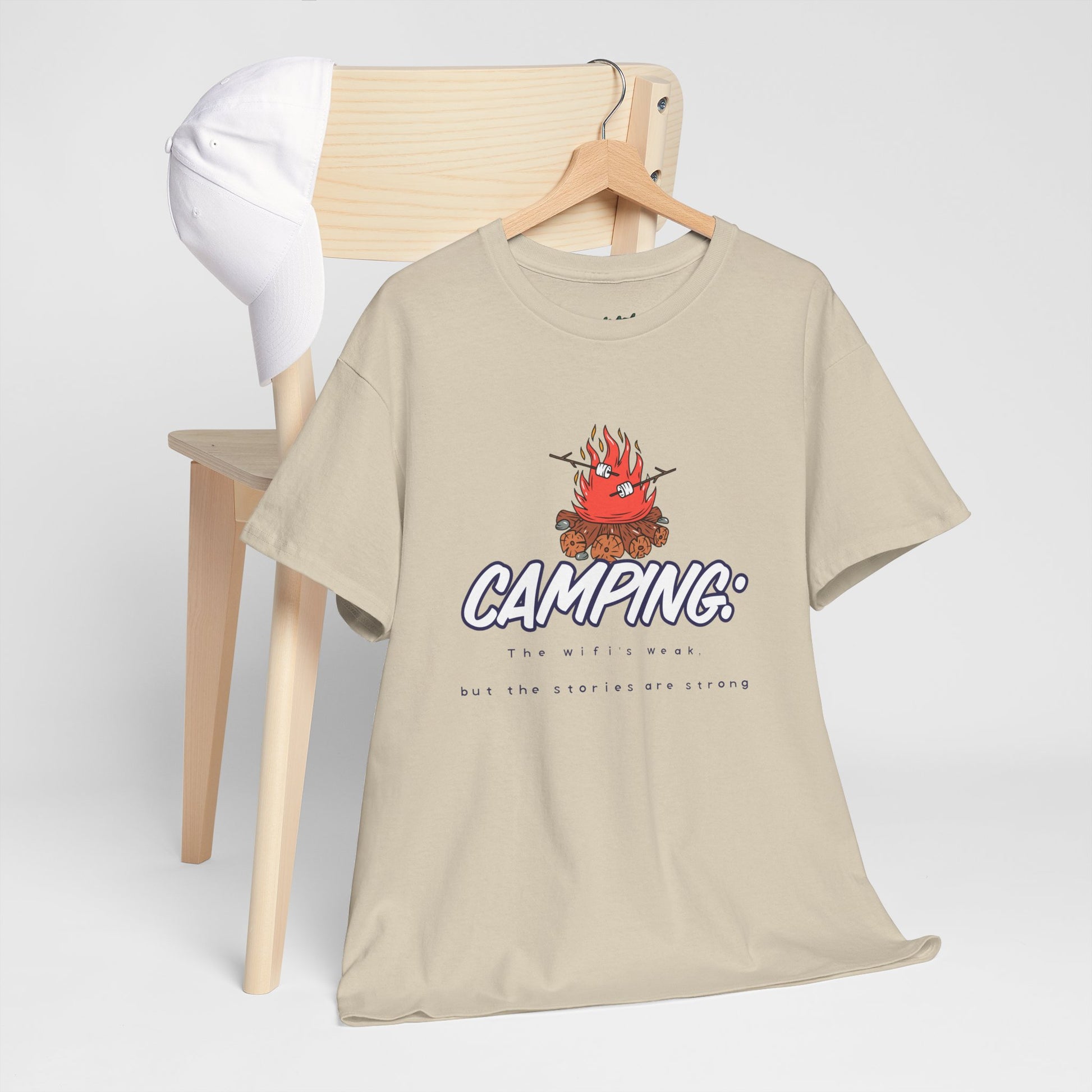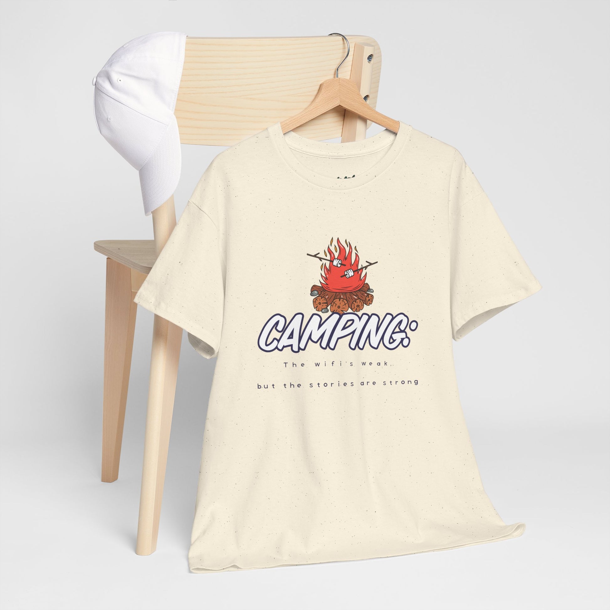 Camping: The WiFi is Weak, But the Stories Are Strong – Funny Camping T-Shirt for Campers & Nature Lovers | Unisex Heavy Cotton Tee, Outdoor Adventure Gift, Summer Camp Apparel