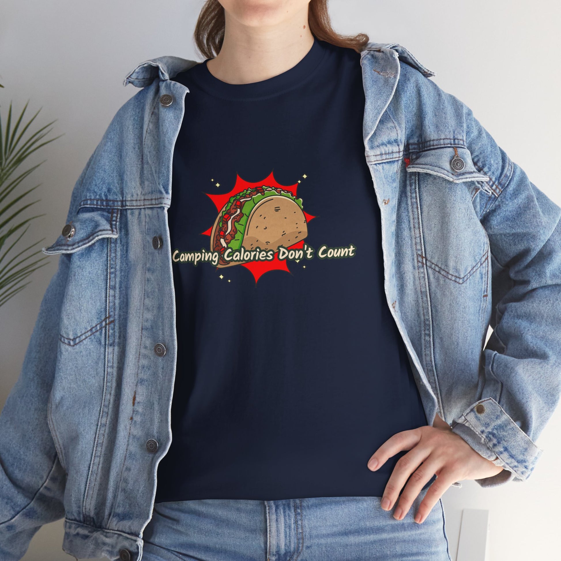 Indulge in fun and flavour with this Camping Calories Don’t Count tee, perfect for taco lovers and outdoor enthusiasts.